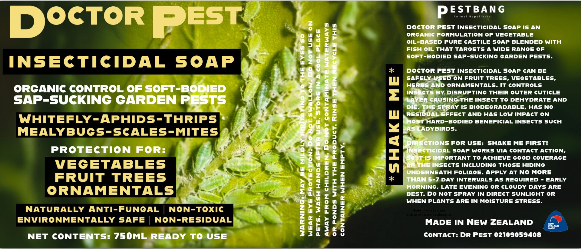 DOCTOR PEST INSECTICIDAL SOAP is an organic formulation of CASTILE PLANT-BASED SOAP + HORTICULTURAL FISH OIL for application to vegetables, ornamentals, plants, fruit trees, etc that are attacked by soft-bodied sap-sucking insects - whitefly, aphids, thrips, scale, mealybugs, mites, bugs, etc. Fish oil smothers eggs and larvae, then helps nurture leaf and plant biology thereby boosting resilience and resistance to disease.